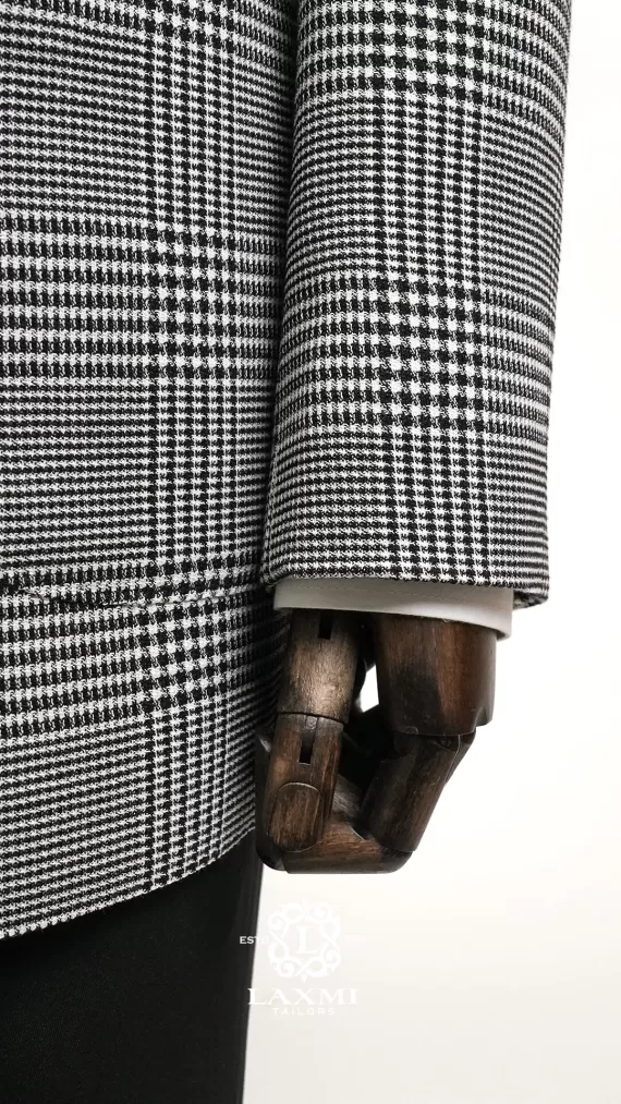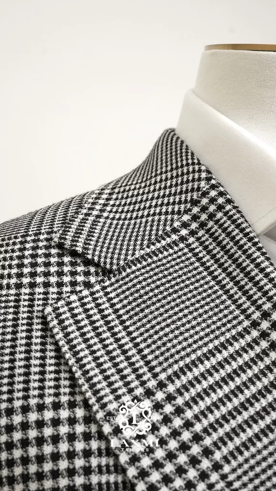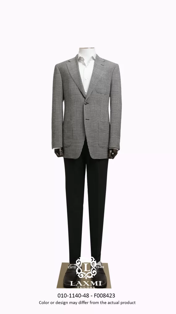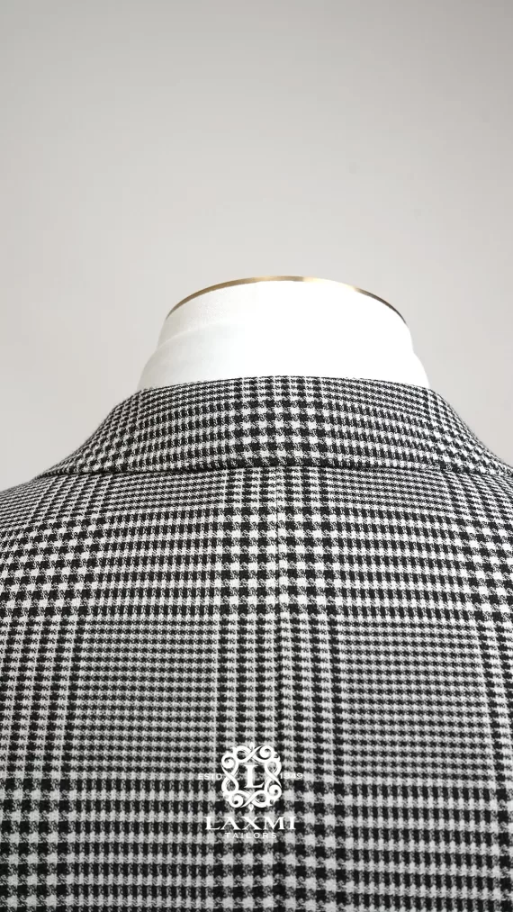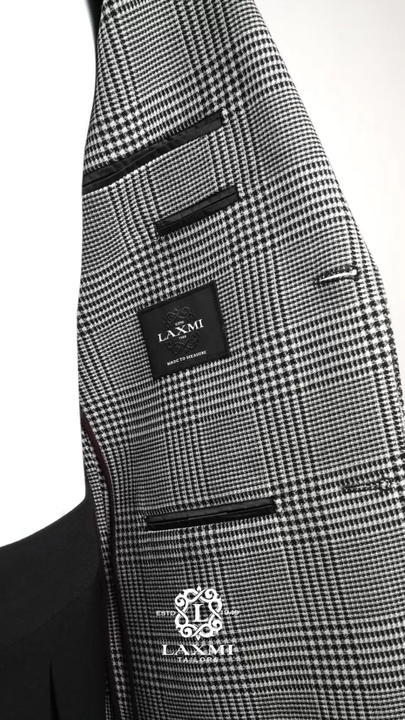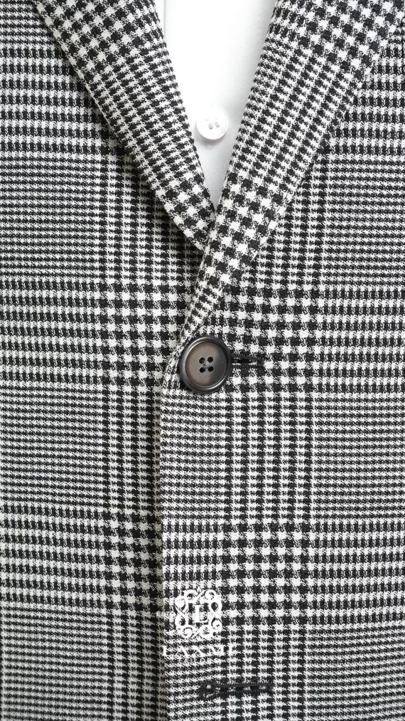 The Laxmi Tailors Grey Prince of Wales Check Suit is a timeless classic in modern tailoring. Crafted from 100% premium wool, this slim fit suit features a refined Prince of Wales check pattern with sharp peak lapels for a confident, distinguished look. The double vent construction allows ease of movement while maintaining a clean silhouette. Perfect for business meetings, weddings, or formal occasions, this versatile suit can be styled with a crisp white shirt for a sophisticated appearance or paired with a turtleneck for a contemporary edge.